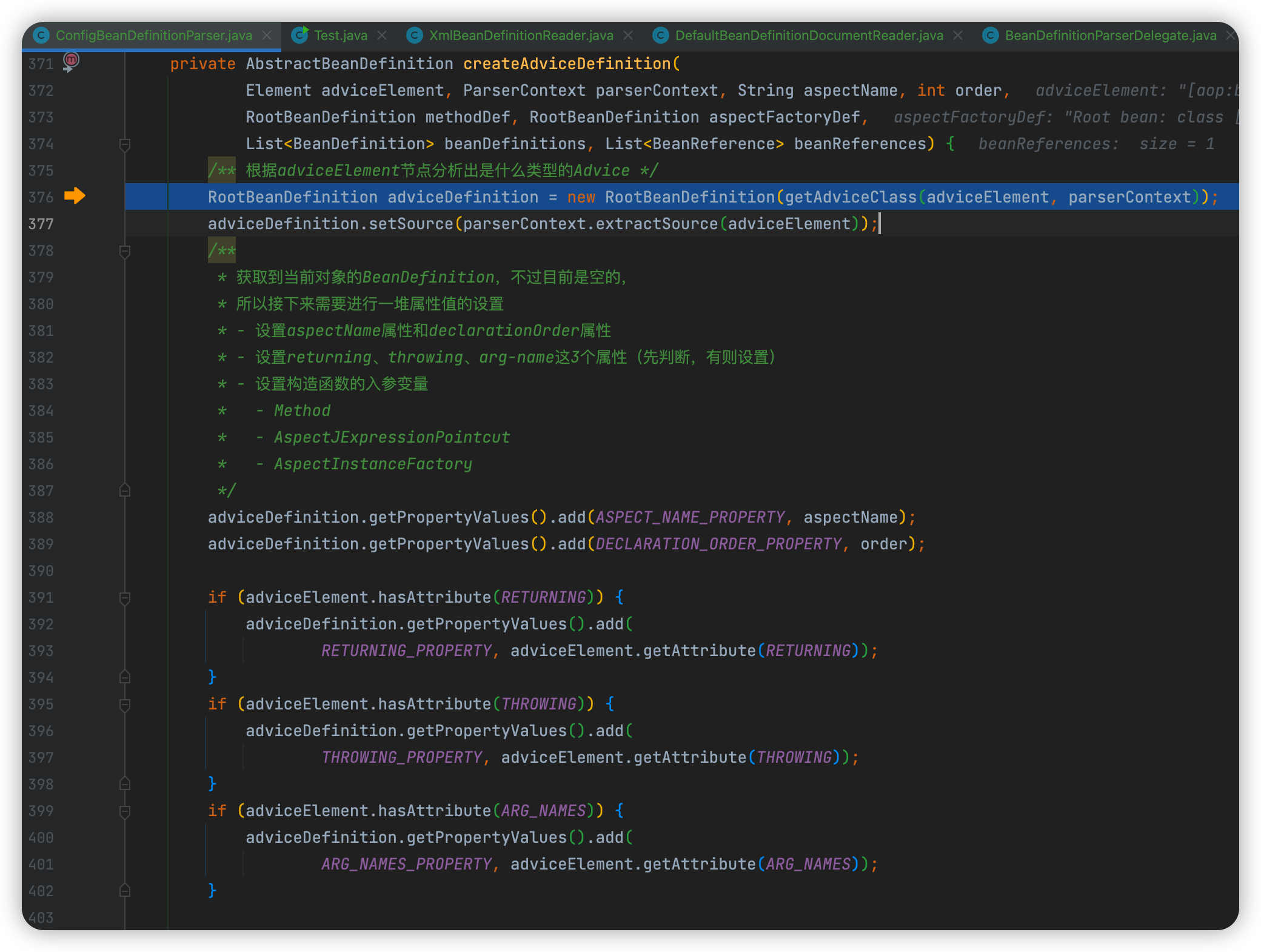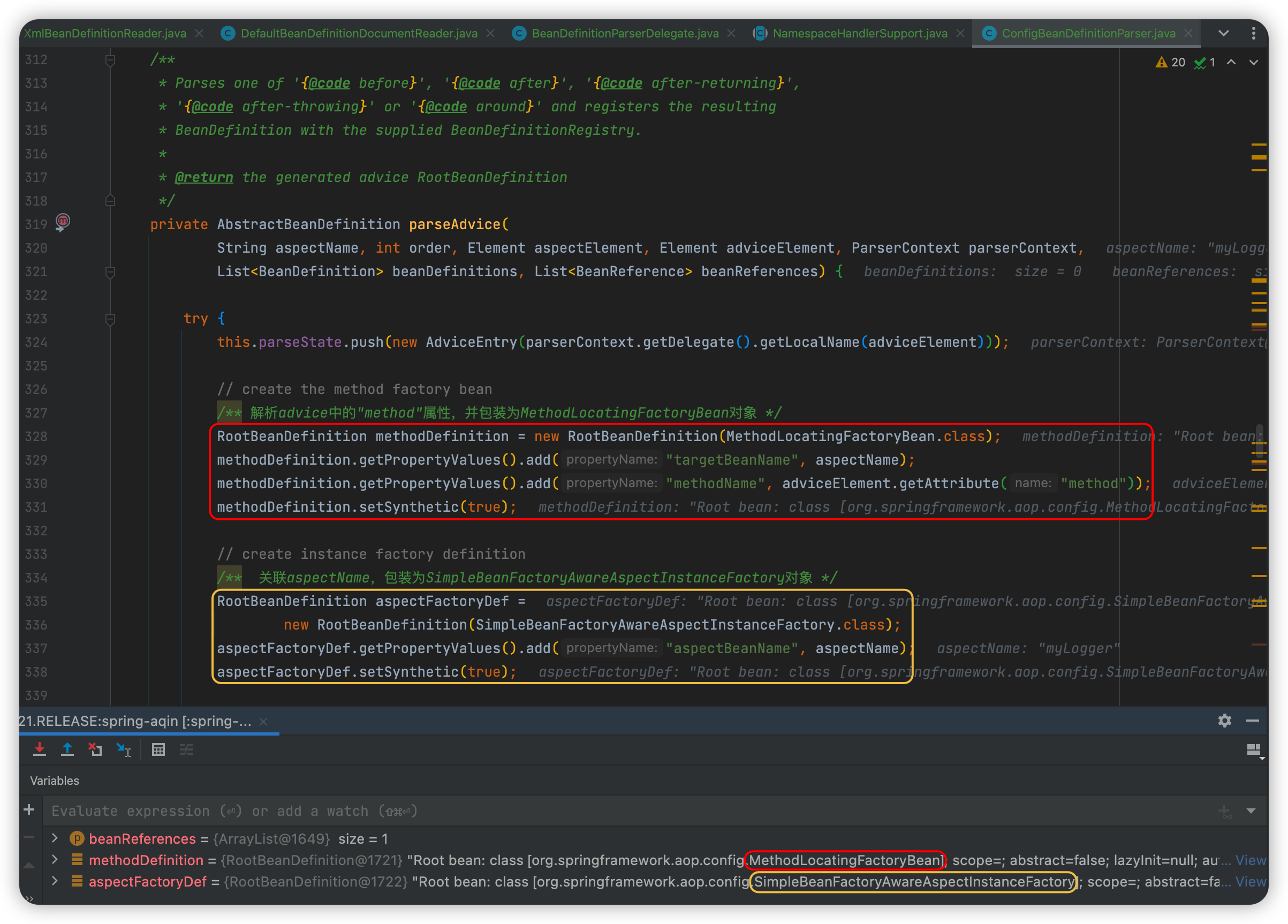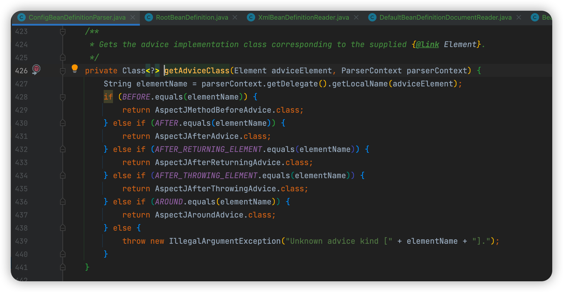 至此,方法createAdviceDefinition()执行结束,返回一个AbstractBeanDefinition类型的对象adviceDef。我们也来回答下介绍方法前的问题:这些生成的RootBeanDefinition对象具体都是哪些类呢?