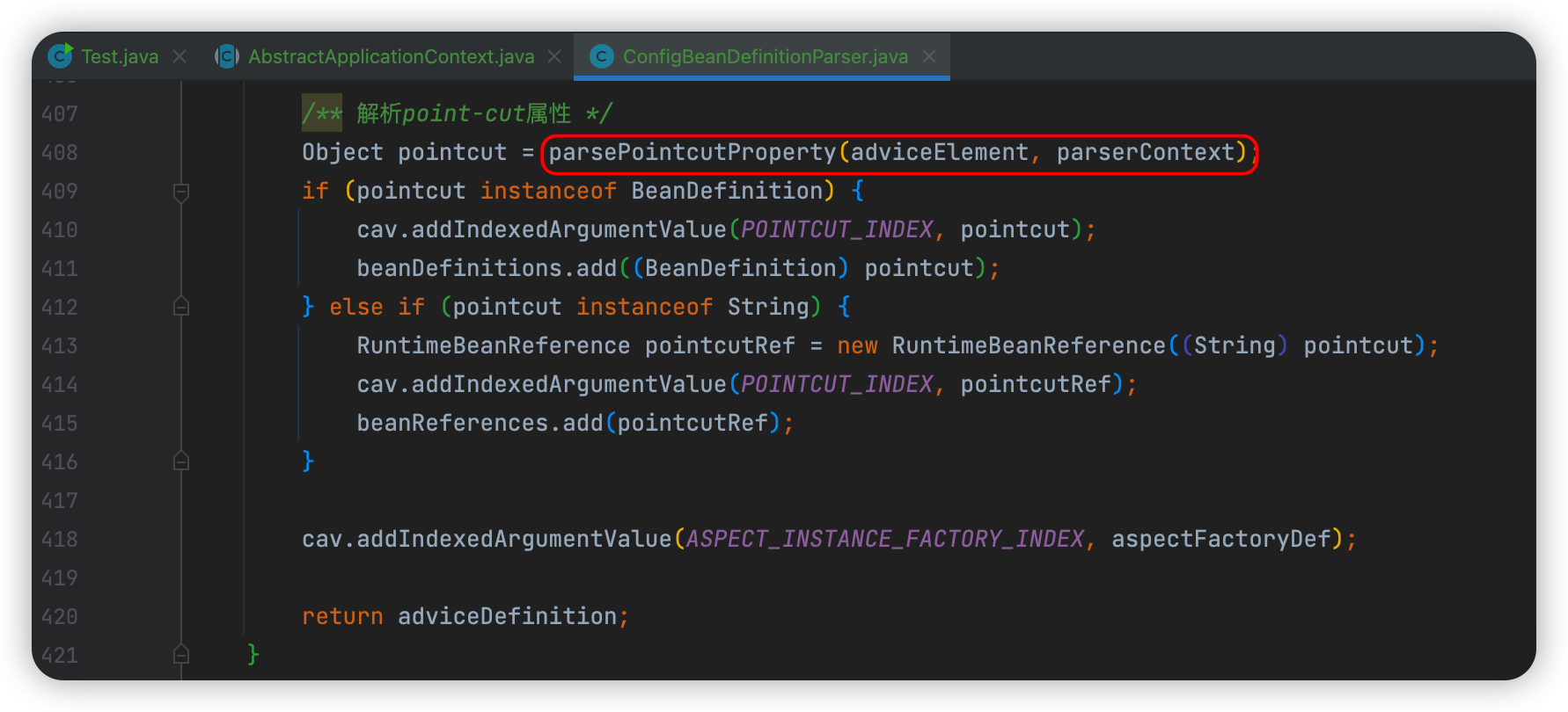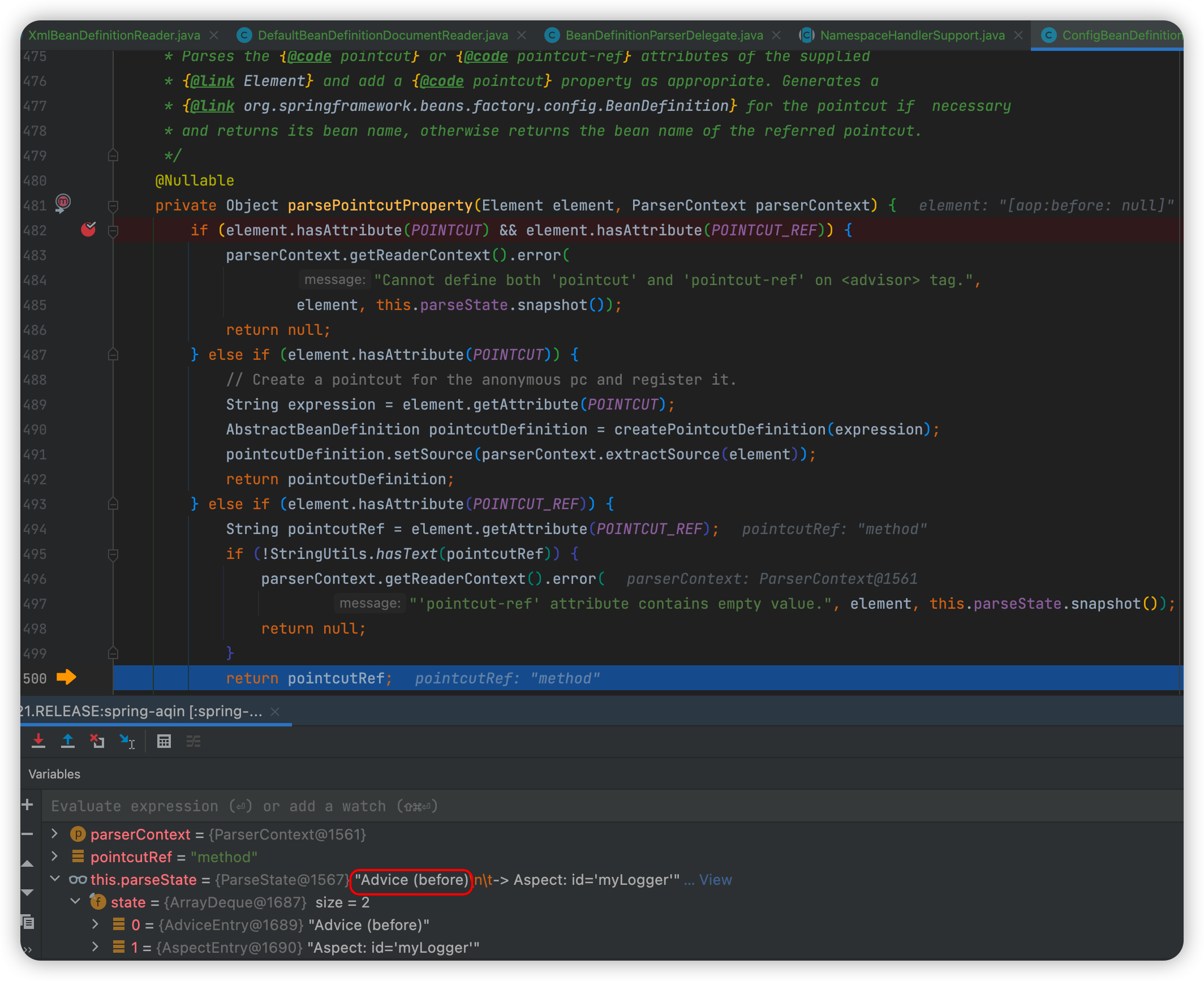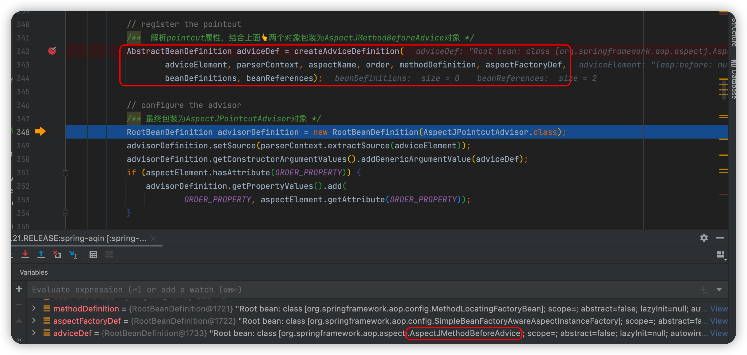 随后解析pointcut属性,将上面👆两个对象传入了方法createAdviceDefinition()中,包装为AspectJMethodBeforeAdvice对象返回并赋值给名为adviceDef的AbstractBeanDefinition对象