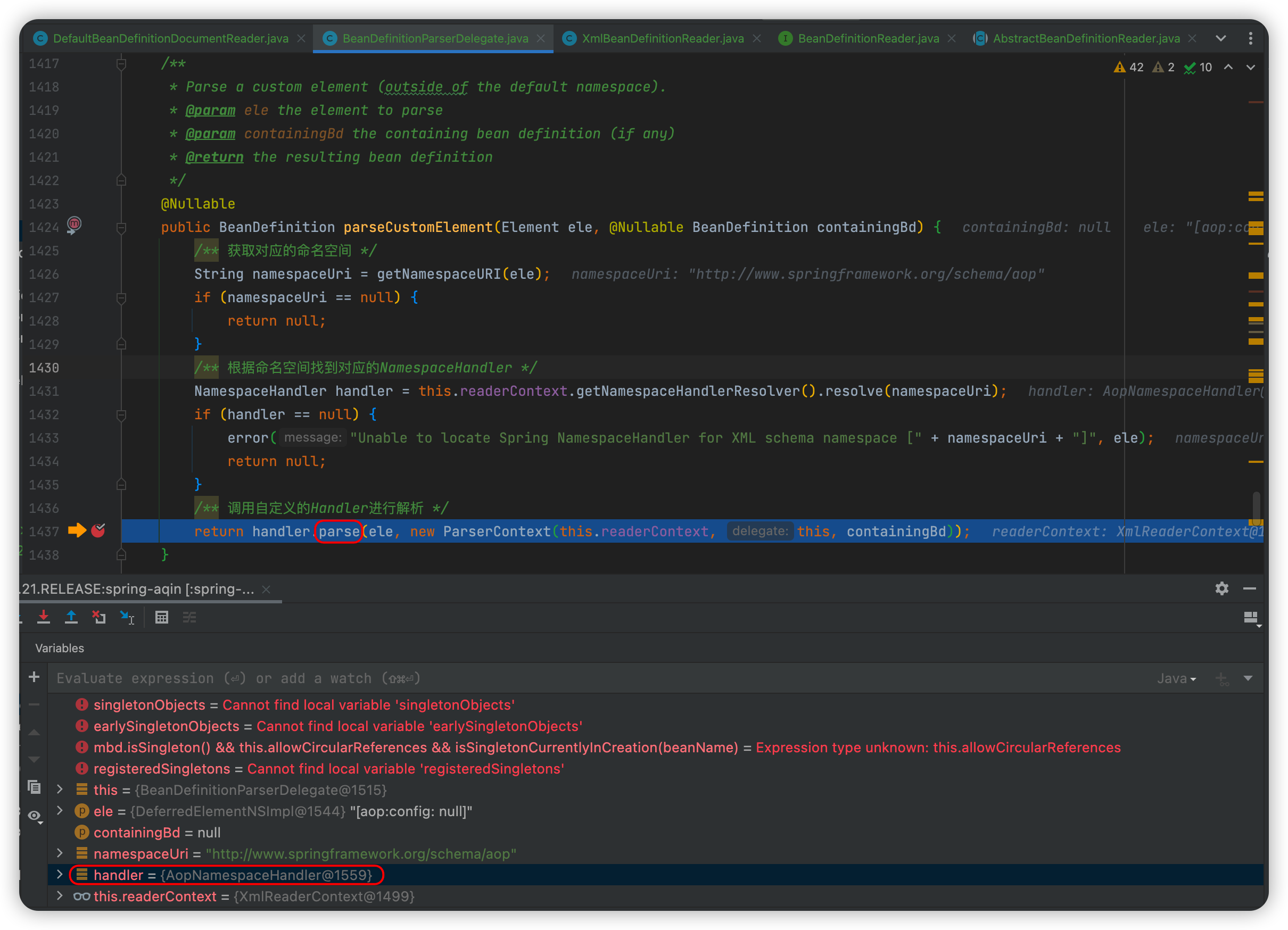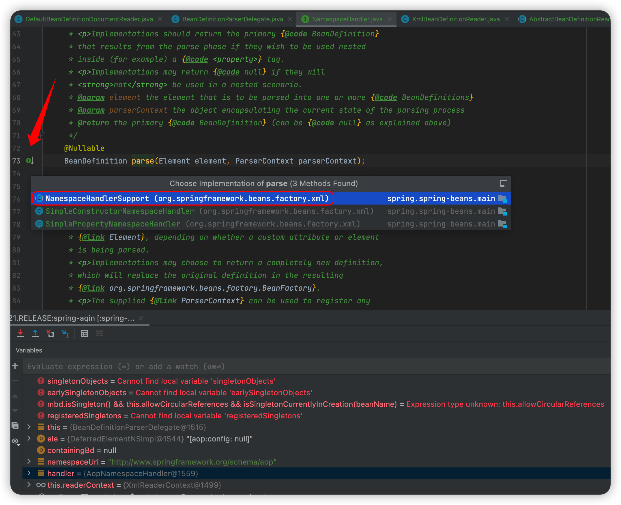 我们可以看到,此时的处理器handler为AopNamespaceHandler