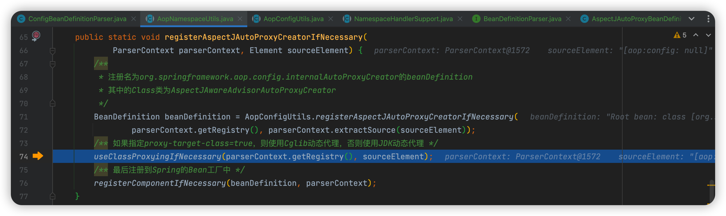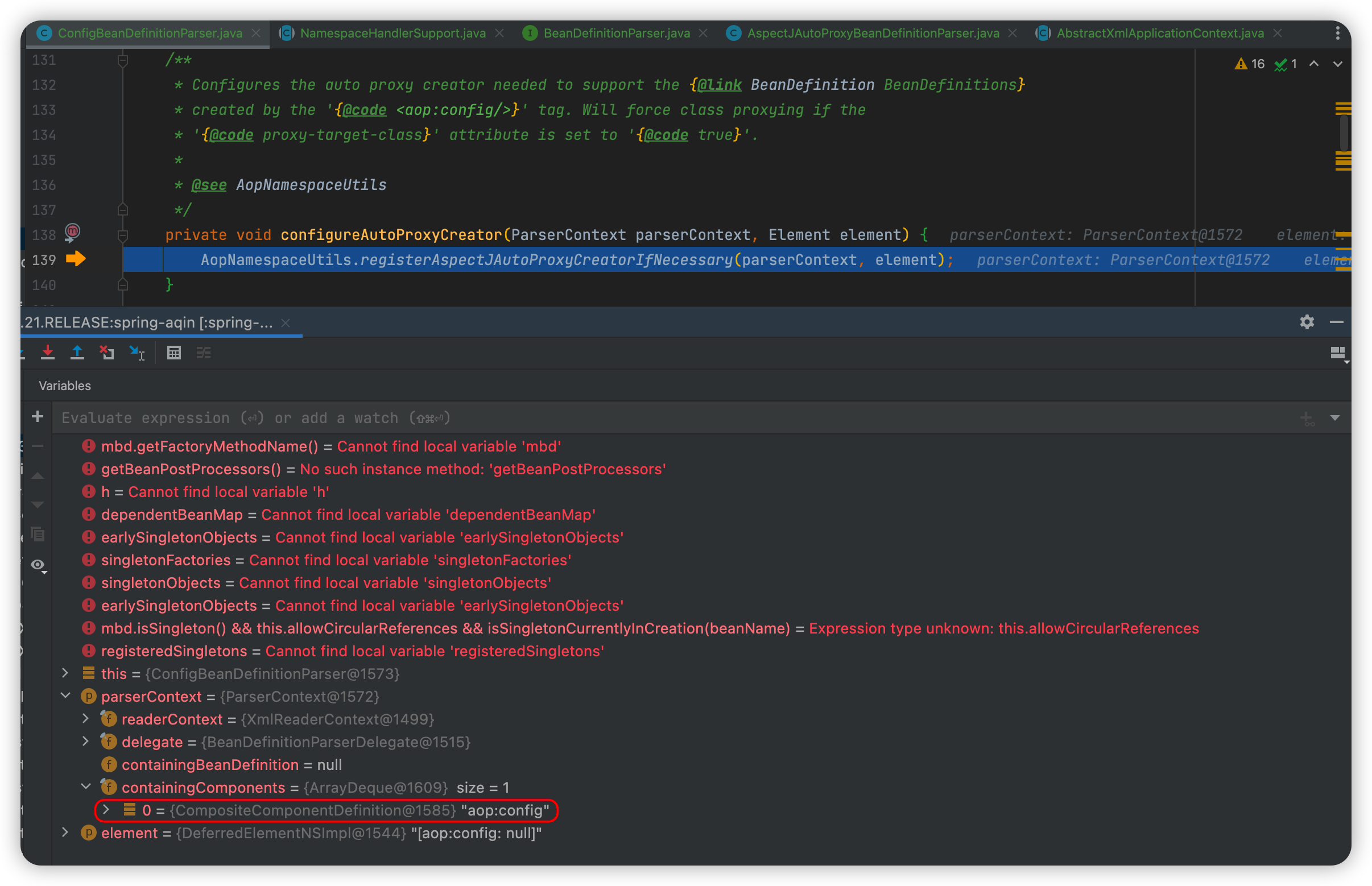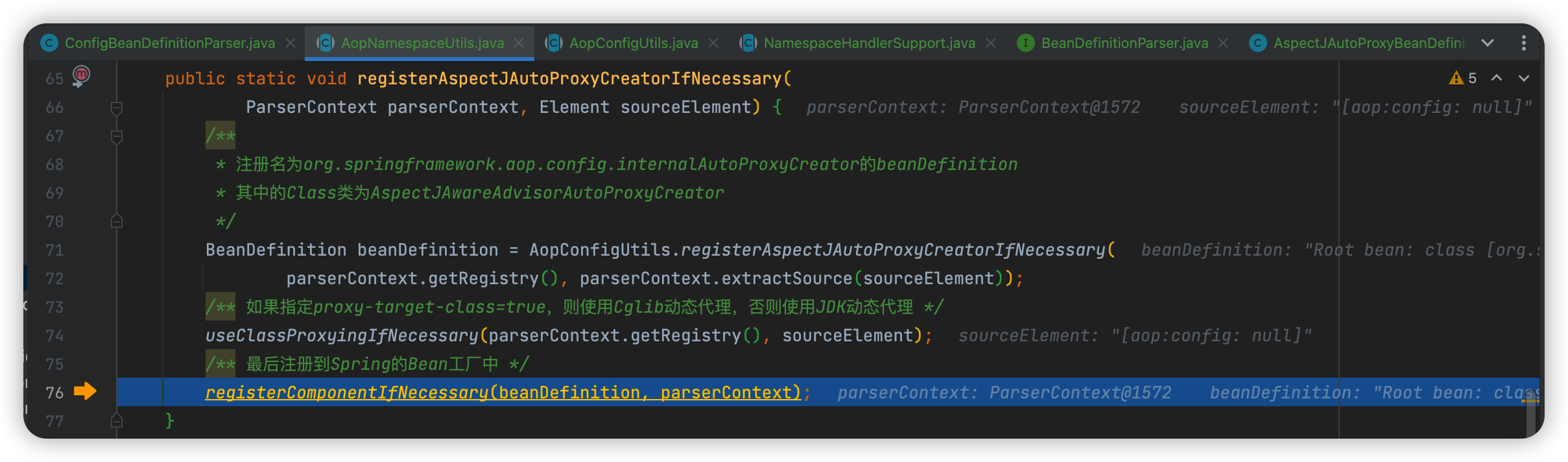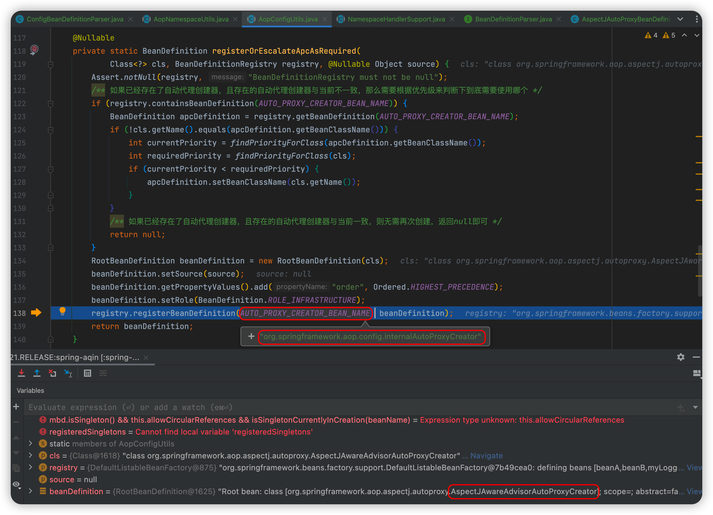 下面的变量表中可以看到,这里注册的Bean名为org.springframework.aop.config.internalAutoProxyCreator的beanDefinition;并且其中的BeanDefinition的具体Class类为AspectJAwareAdvisorAutoProxyCreator