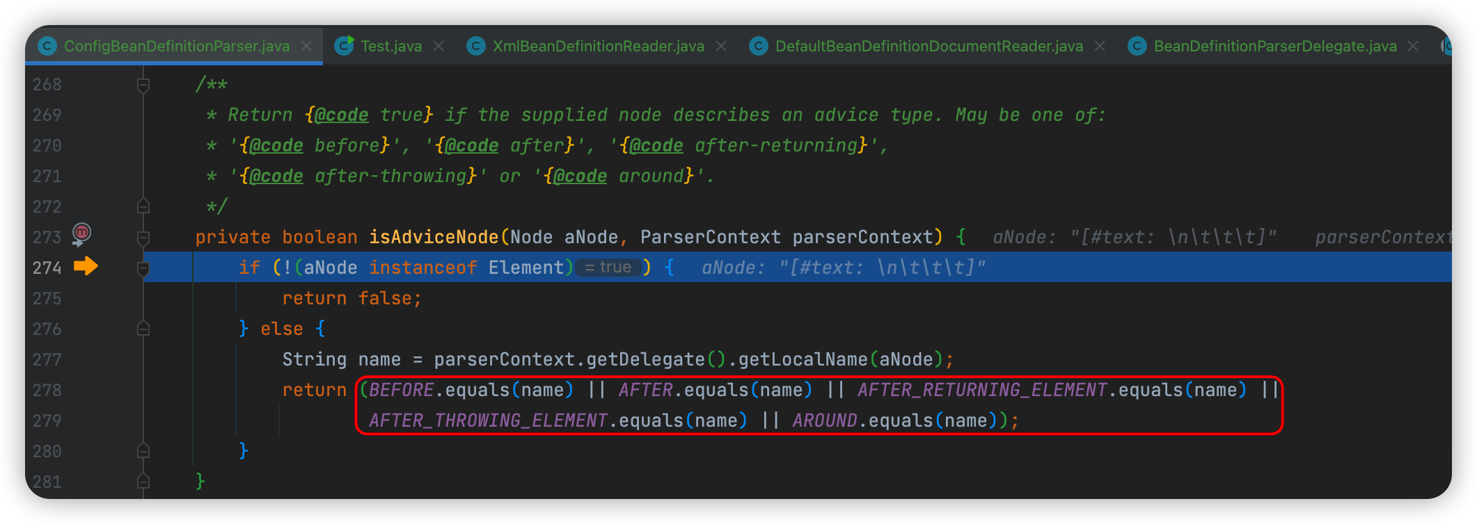 在获取到节点后,遍历循环,解析其下的Advice类型的节点,通过调用isAdviceNode()判断遍历到的当前节点是否为Advice类型的节点