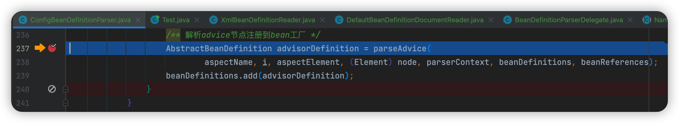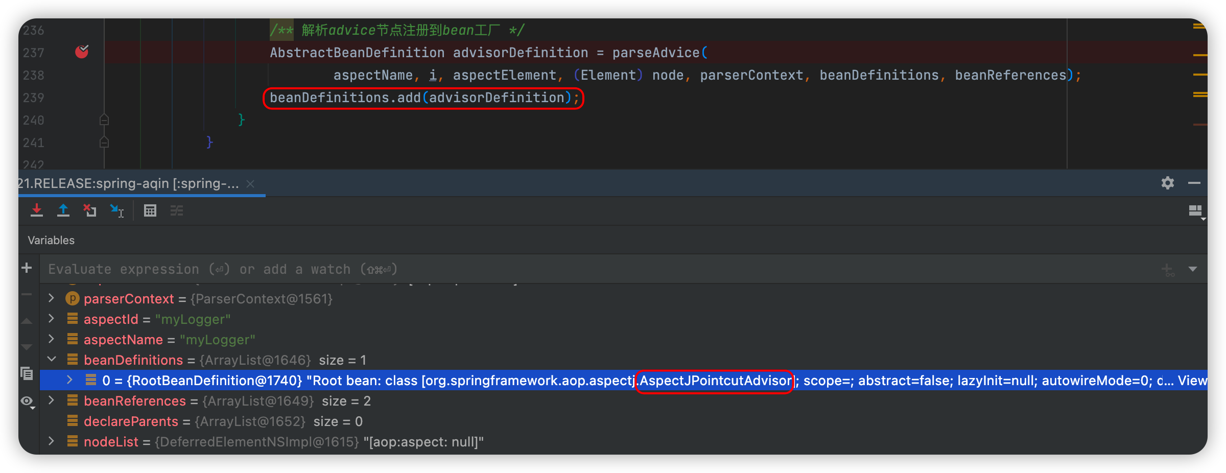 回到方法parseAspect()中,将当前解析过的beanDefinition(advisorDefinition)添加进集合beanDefinitions中