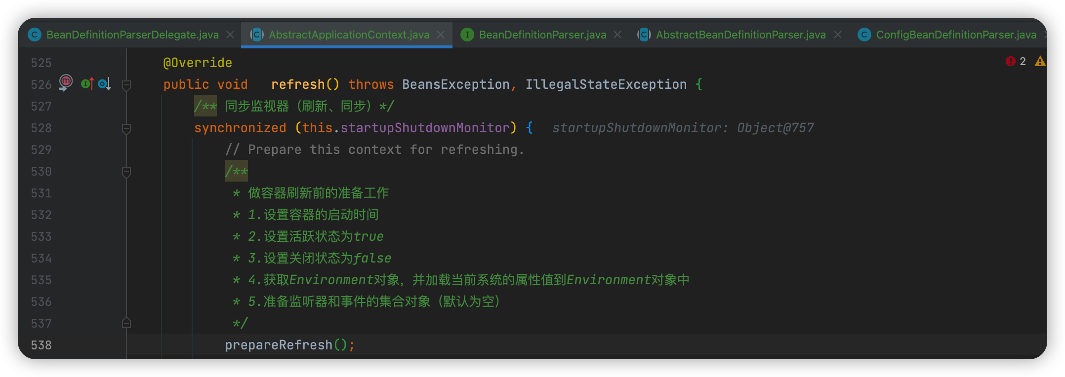 进入refresh()方法后,先调用prepareRefresh()方法进行的是容器刷新前的准备工作,这里的准备工作大致包括5个内容: