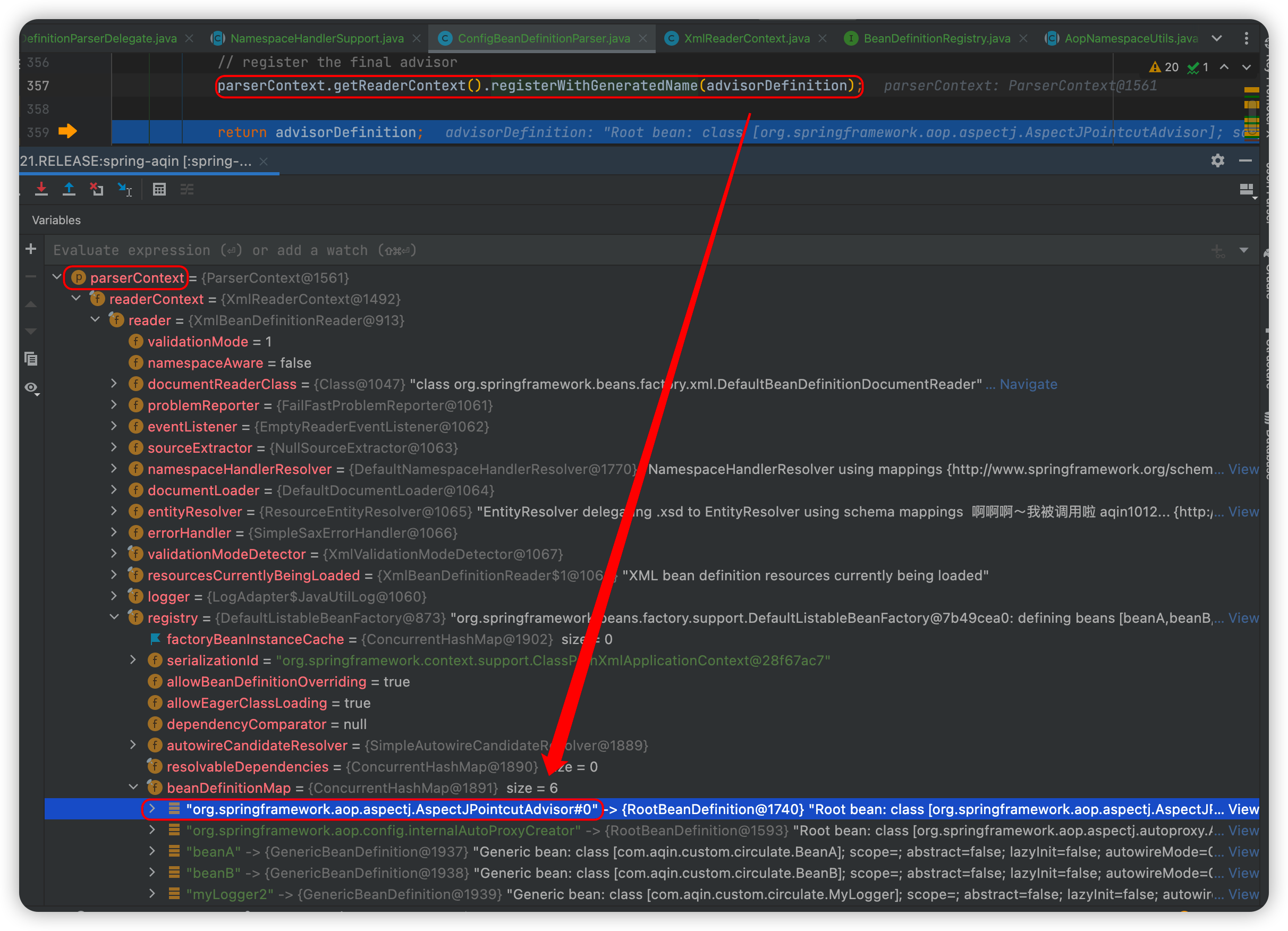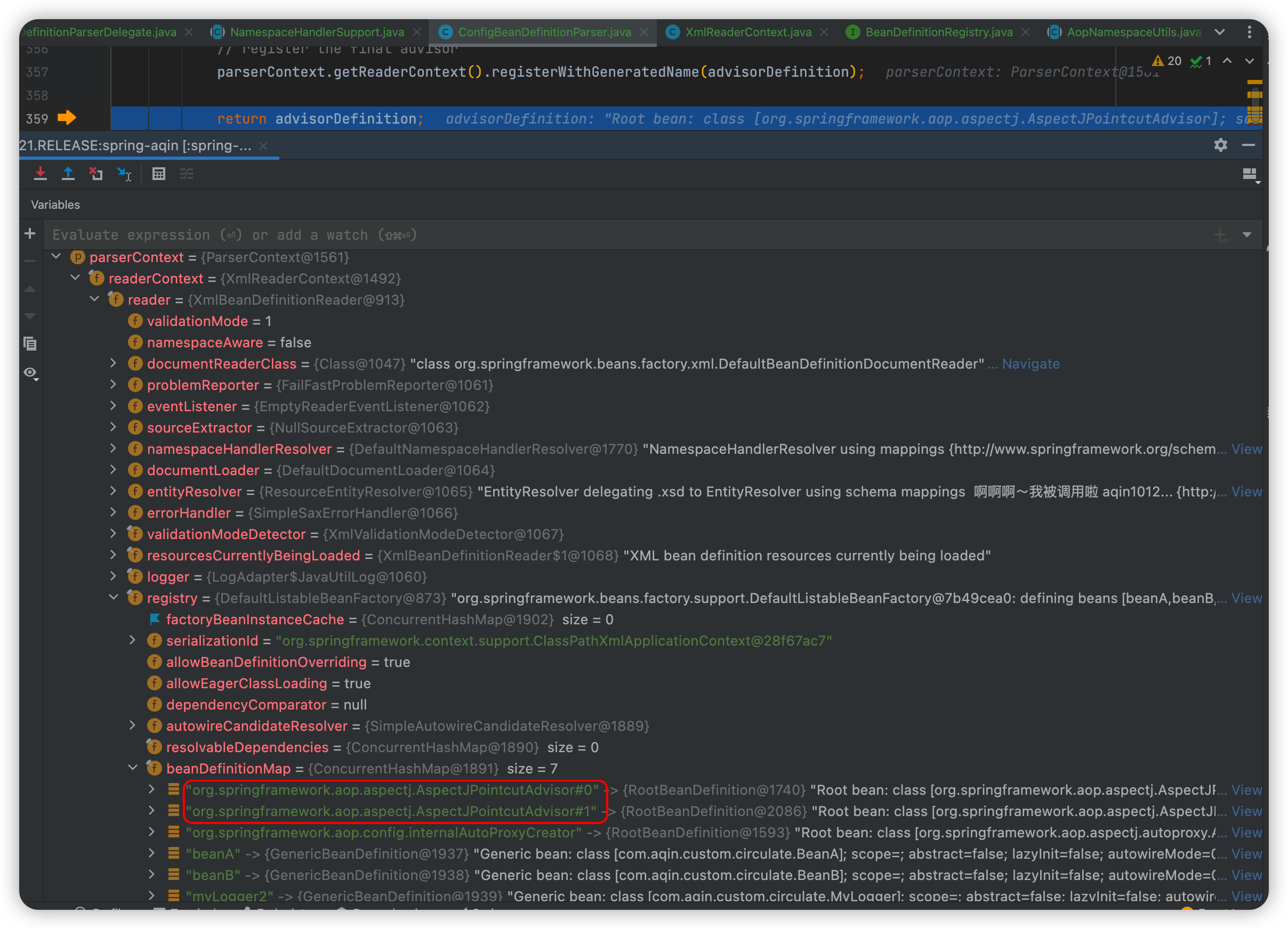 第二次循环执行完成在parseContext对象的readerContext -> reader -> registry -> beanDefinitionMap属性中又多了一个AspectJPointcutAdvisor对象(AspectJPointcutAdvisor#1),嘿嘿没错每完成一次循环就会多一个~~0、1、2……递增
