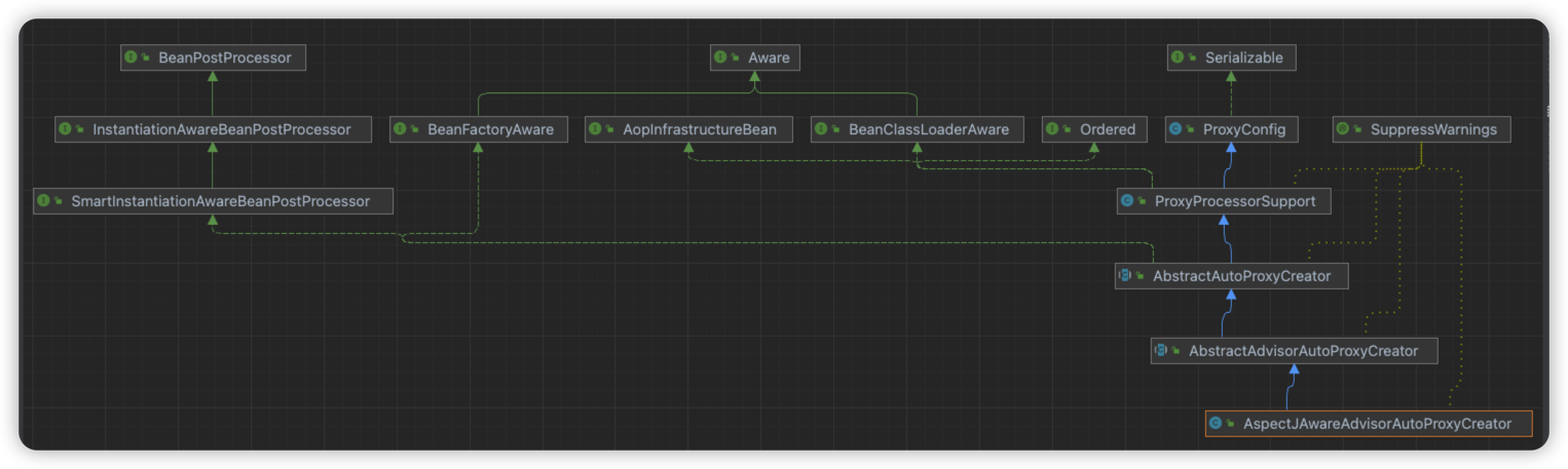 那么问题来了:AspectJAwareAdvisorAutoProxyCreator跟我们熟悉的那些BeanPostProcessor、Aware等等有什么关系么?