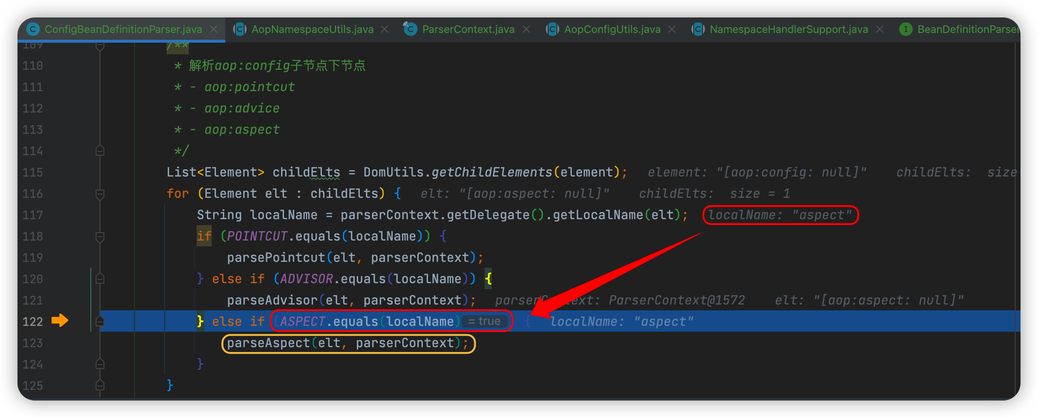 由于获取到的localName为"aspect",满足ASPECT.equals(localName)为true的条件,所以进入parseAspect()方法中