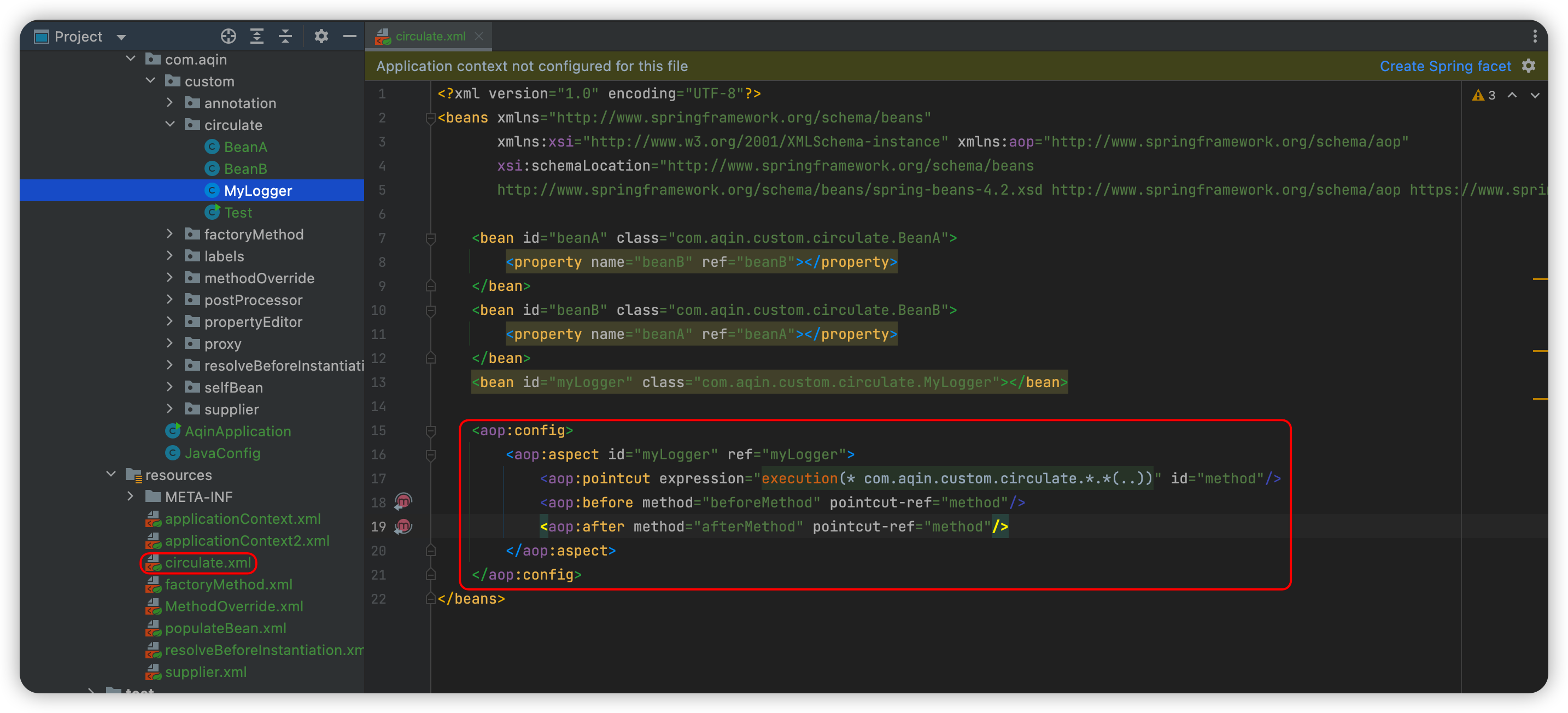 拿之前分析循环的时候举的例子🌰,它的日志切面就是通过xml进行配置的(配置文件📃内容如下,完整测试代码可参考【实践向】当移除了三级缓存…… 中的示例代码)