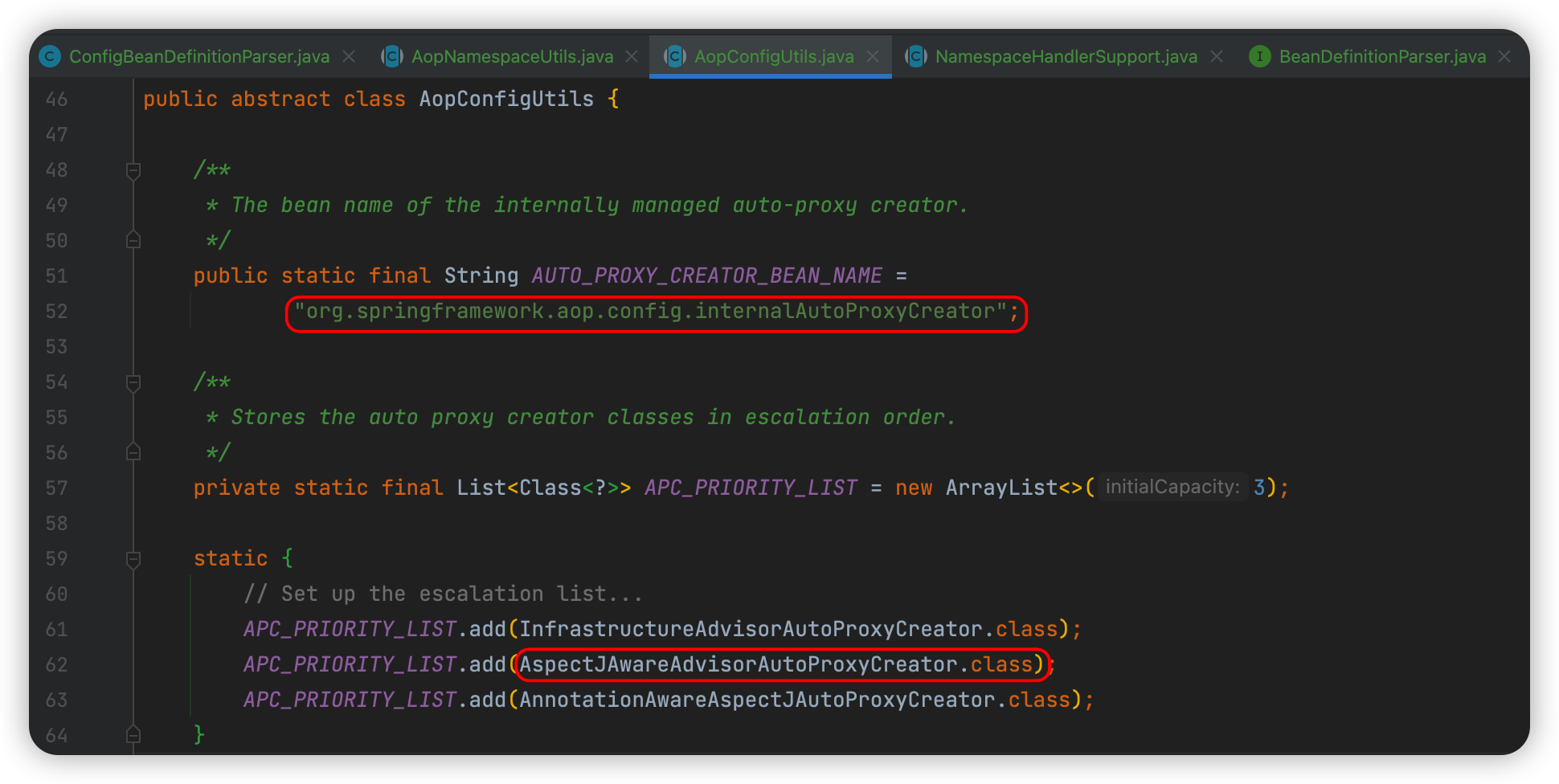 由下图的静态代码块中也同样添加了InfrastructureAdvisorAutoProxyCreator和AnnotationAwareAspectJAutoProxyCreator这两个类,因此可以推断出他俩的注册流程与AspectJAwareAdvisorAutoProxyCreator类似