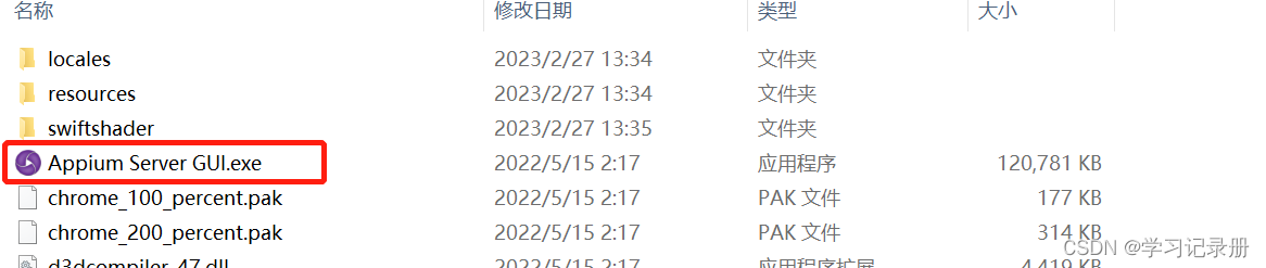 从网址https://github.com/appium/appium-inspector/releases 下载对应安装包Appium-Server-GUI-windows-1.22.2.zip,解压到你想存放的位置如下图,双击图标,打开服务端