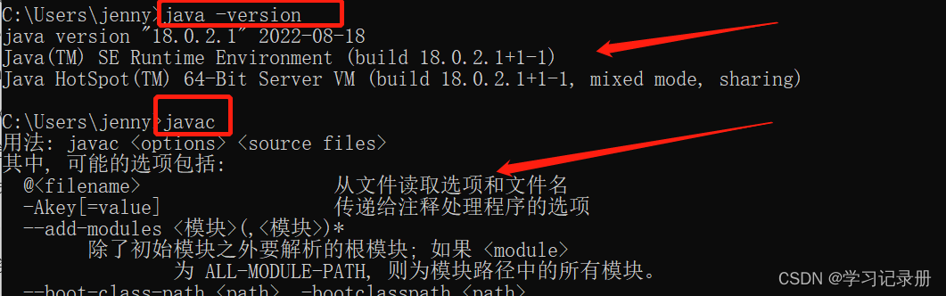 测试是否安装成功:cmd输入 java -version 和 javac后出现以下内容说明安装成功