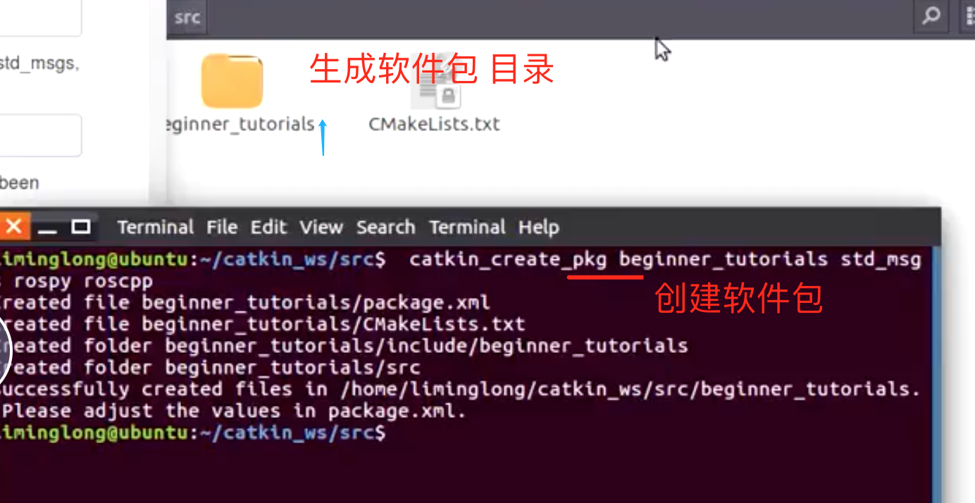 如:catkin_create_pkg beginner_tutorials std_msgs rospy roscpp