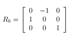 这主要按列来看,xb和a坐标系的y轴正方向一致,所以Rb的第一列就是(0,1,0),多出的那个1就代表了a坐标系的y轴。yb和a坐标系的x轴正方向相反,所以Rb的第二列就是(-1,0,0),-1出现在第一位对应a坐标系的x轴,-1代表反向。z轴同理。