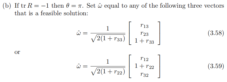 这里需要回顾上面讲的,从R到w和θ的过程。(即分为R是单位阵,以及R的迹是-1或不是-1的情况),所以认为w和θ已经可以求出来了。那么其实就差一个v了,v可以通过一个公式得到: