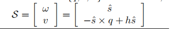 这里其实也好理解,主要费解的是下面的v。v是由两项构成的,-\hat{s}\dot{\theta} \times q表示绕螺旋轴的移动。这个需要看图,配合右手螺旋定则才能理解,我这里就不写了。另一项h\hat{s}\dot{\theta}是沿着轴的移动,这两项方向是正交的。