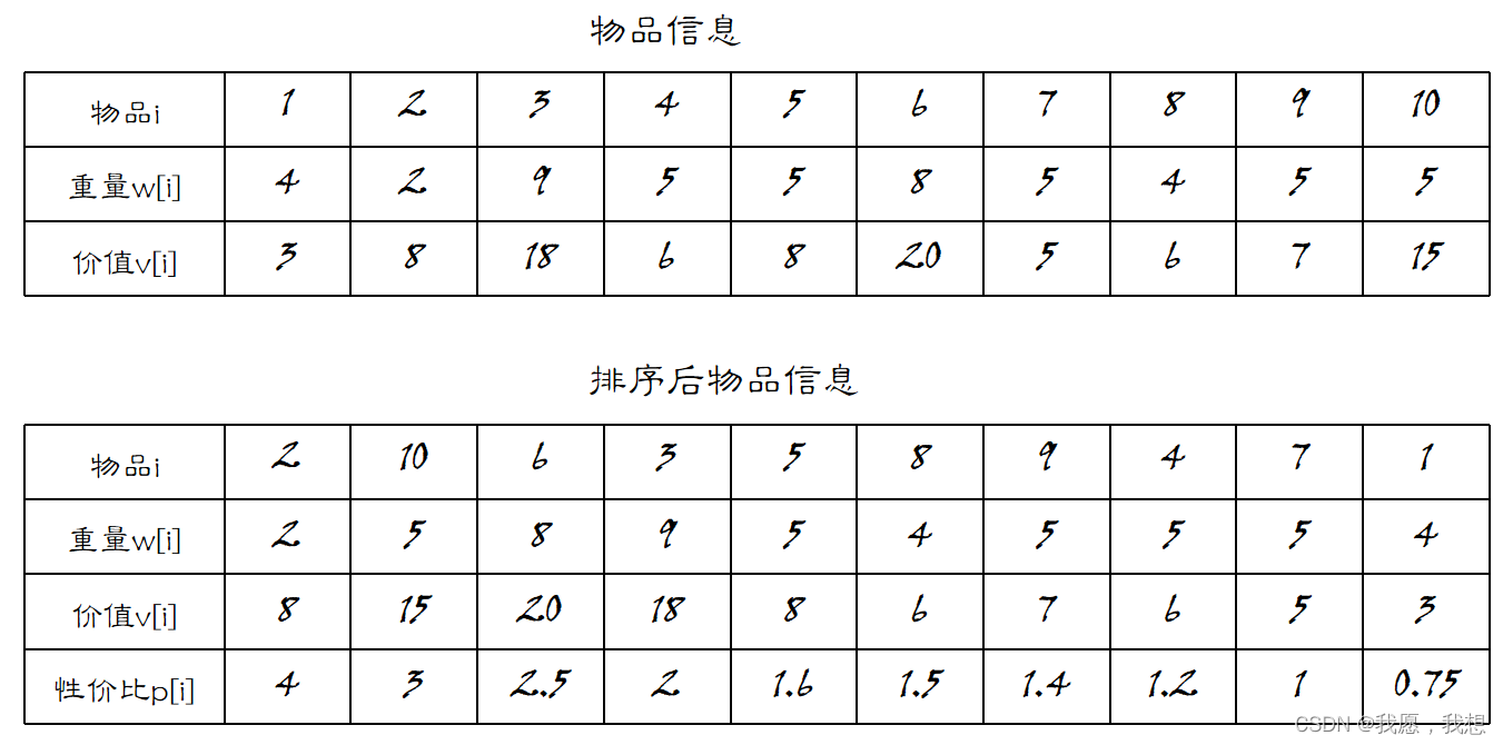 {cout << "请依次输入物品的重量和价值:" << endl;for (int i = 0; i < n; i++){ps[i].n = i;//物品编号cin >>ps[i].w >> ps[i].v;//初始化物品重量和价值ps[i].p = (double)ps[i].v / (double)ps[i].w;//性价比ps[i].c = 0;//都没有放入背包}