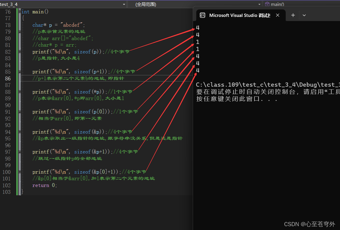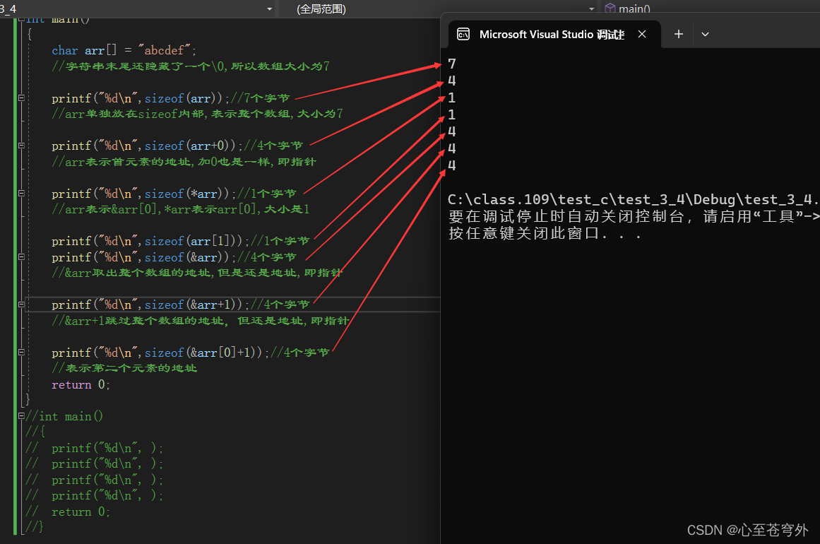 {char arr[] = "abcdef";//字符串末尾还隐藏了一个\0,所以数组大小为7printf("%d\n",sizeof(arr));//7个字节//arr单独放在sizeof内部,表示整个数组,大小为7printf("%d\n",sizeof(arr+0));//4个字节//arr表示首元素的地址,加0也是一样,即指针printf("%d\n",sizeof(*arr));//1个字节//arr表示&arr[0],*arr表示arr[0],大小是1printf("%d\n",sizeof(arr[1]));//1个字节printf("%d\n",sizeof(&arr));//4个字节//&arr取出整个数组的地址,但是还是地址,即指针printf("%d\n",sizeof(&arr+1));//4个字节//&arr+1跳过整个数组的地址,但还是地址,即指针printf("%d\n",sizeof(&arr[0]+1));//4个字节//表示第二个元素的地址return 0;