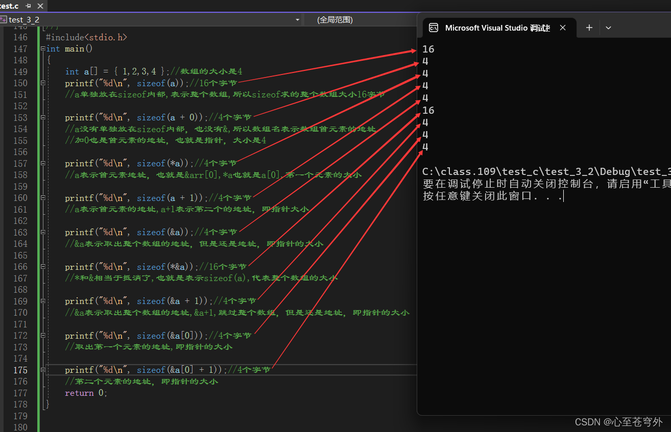 {int a[] = { 1,2,3,4 };//数组的大小是4printf("%d\n", sizeof(a));//16个字节//a单独放在sizeof内部,表示整个数组,所以sizeof求的整个数组大小16字节printf("%d\n", sizeof(a + 0));//4个字节//a没有单独放在sizeof内部,也没有&,所以数组名表示数组首元素的地址//加0也是首元素的地址,也就是指针,大小是4printf("%d\n", sizeof(*a));//4个字节//a表示首元素地址,也就是&arr[0],*a也就是a[0],第一个元素的大小printf("%d\n", sizeof(a + 1));//4个字节//a表示首元素的地址,a+1表示第二个的地址,即指针大小printf("%d\n", sizeof(&a));//4个字节//&a表示取出整个数组的地址,但是还是地址,即指针的大小printf("%d\n", sizeof(*&a));//16个字节//*和&相当于抵消了,也就是表示sizeof(a),代表整个数组的大小printf("%d\n", sizeof(&a + 1));//4个字节//&a表示取出整个数组的地址,&a+1,跳过整个数组,但是还是地址,即指针的大小printf("%d\n", sizeof(&a[0]));//4个字节//取出第一个元素的地址,即指针的大小printf("%d\n", sizeof(&a[0] + 1));//4个字节//第二个元素的地址,即指针的大小return 0;