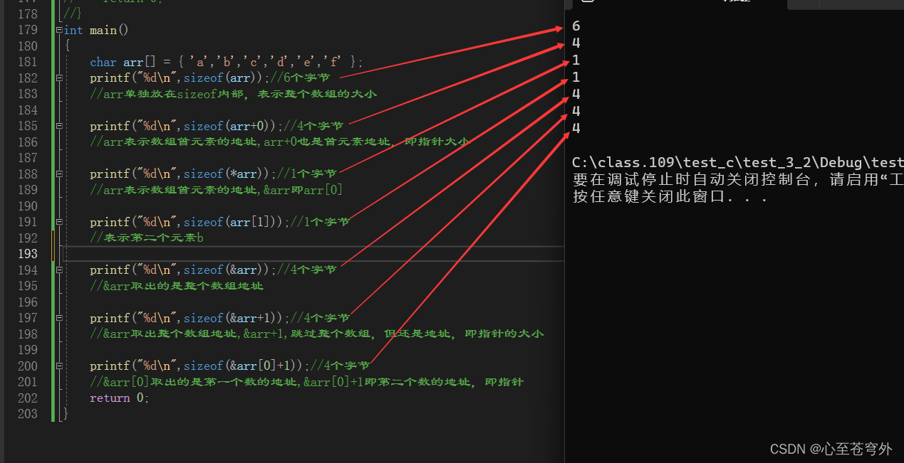 {char arr[] = { 'a','b','c','d','e','f' };printf("%d\n",sizeof(arr));//6个字节//arr单独放在sizeof内部,表示整个数组的大小printf("%d\n",sizeof(arr+0));//4个字节//arr表示数组首元素的地址,arr+0也是首元素地址,即指针大小printf("%d\n",sizeof(*arr));//1个字节//arr表示数组首元素的地址,&arr即arr[0]printf("%d\n",sizeof(arr[1]));//1个字节//表示第二个元素bprintf("%d\n",sizeof(&arr));//4个字节//&arr取出的是整个数组地址printf("%d\n",sizeof(&arr+1));//4个字节//&arr取出整个数组地址,&arr+1,跳过整个数组,但还是地址,即指针的大小printf("%d\n",sizeof(&arr[0]+1));//4个字节//&arr[0]取出的是第一个数的地址,&arr[0]+1即第二个数的地址,即指针return 0;