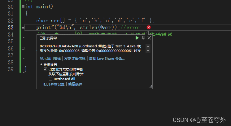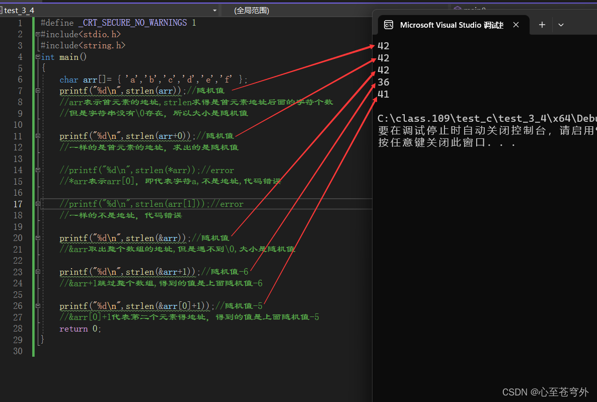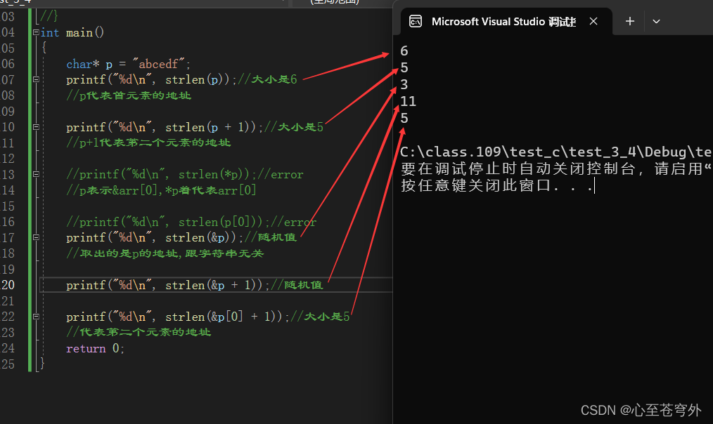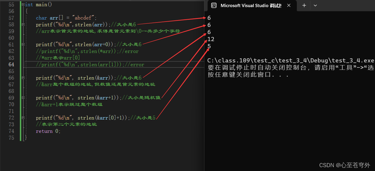 {char arr[] = "abcdef";printf("%d\n",strlen(arr));//大小是6//arr表示首元素的地址,求得是首元素到\0一共多少个字符printf("%d\n",strlen(arr+0));//大小是6printf("%d\n",strlen(*arr));//error//*arr表示arr[0]printf("%d\n",strlen(arr[1]));//errorprintf("%d\n", strlen(&arr));//大小是6//&arr整个数组的地址,但数值还是首元素的地址printf("%d\n", strlen(&arr+1));//大小是随机值//&arr+1表示跳过整个数组printf("%d\n", strlen(&arr[0]+1));//大小是5//表示第二个元素的地址return 0;