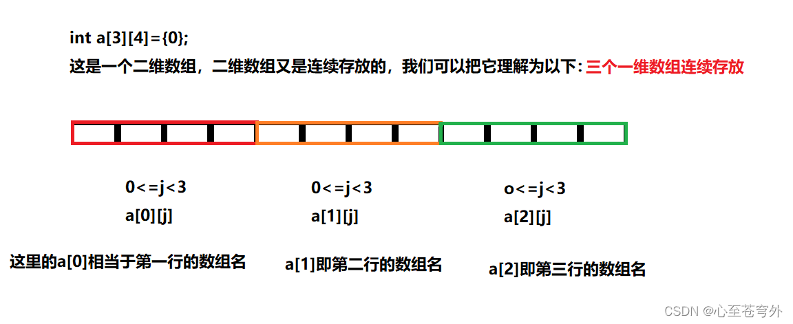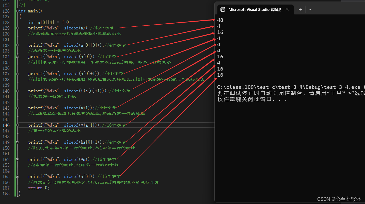 {int a[3][4] = { 0 };printf("%d\n", sizeof(a));//48个字节//a单独放在sizeof内部表示整个数组的大小printf("%d\n", sizeof(a[0][0]));//4个字节//表示第一个元素的大小printf("%d\n", sizeof(a[0]));//16字节//a[0]表示第一行的数组名。单独放在sizeof内部,即第一行的大小printf("%d\n", sizeof(a[0]+1));//4个字节//a[0]表示第一行的数组名,即数组首元素的地址,a[0]+1表示第一行第二个数的地址printf("%d\n", sizeof(*(a[0]+1)));//4个字节//代表第一行第二个数printf("%d\n", sizeof(a+1));//4个字节//二维数组的数组名首元素的地址,即表示第一行的地址printf("%d\n", sizeof(*(a+1)));//16个字节//第一行的四个数的大小printf("%d\n", sizeof(&a[0]+1));//4个字节//&a[0]代表取出第一行的地址,加1即第二行的地址printf("%d\n", sizeof(*a));//16个字节//a表示第一行的地址,*a即第一行的四个数printf("%d\n", sizeof(a[3]));//16个字节//感觉a[3]已经数组越界了,但是sizeof内部的值不会进行计算return 0;