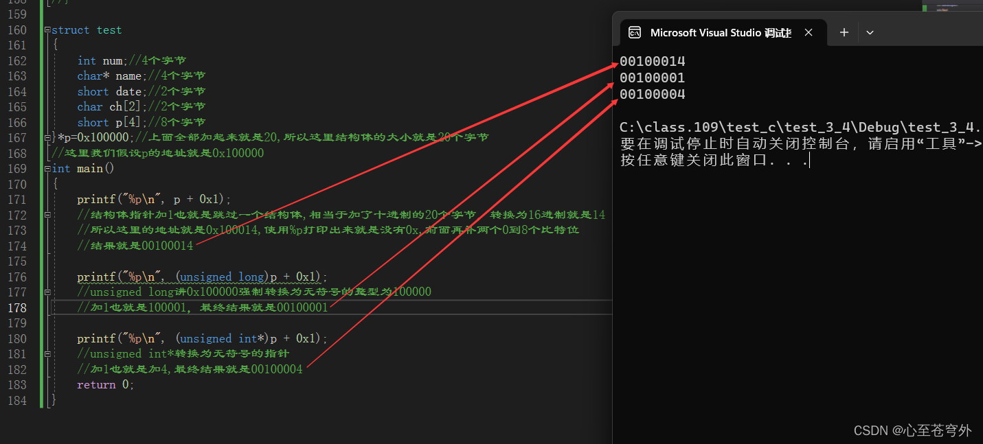 {printf("%p\n", p + 0x1);//结构体指针加1也就是跳过一个结构体,相当于加了十进制的20个字节,转换为16进制就是14//所以这里的地址就是0x100014,使用%p打印出来就是没有0x,前面再补两个0到8个比特位//结果就是00100014printf("%p\n", (unsigned long)p + 0x1);//unsigned long讲0x100000强制转换为无符号的整型为100000//加1也就是100001,最终结果就是00100001printf("%p\n", (unsigned int*)p + 0x1);//unsigned int*转换为无符号的指针//加1也就是加4,最终结果就是00100004return 0;