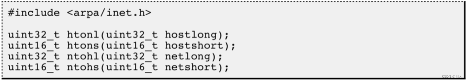 为使网络程序具有可移植性,使同样的C代码在大端和小端计算机上编译后都能正常运行,可以调用以下库函数做网络字节序和主机字节序的转换。