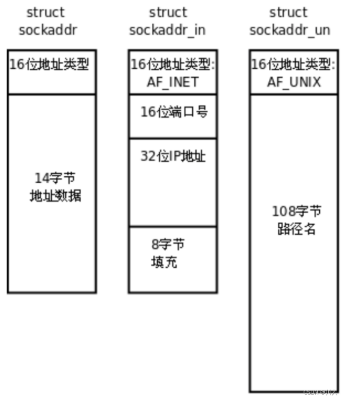 所以,为了让套接字的网络通信和本地通信能够使用同一套函数接口,于是就出现了 struct sockaddr 结构体,该结构体与 struct sockaddr_in 和 struct sockaddr_un 的结构都不相同,但这三个结构体头部的16个比特位都是一样的,叫做地址类型,就是表明其是网络通信的套接字还是本地通信的套接字。