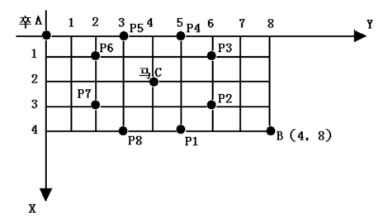 如图,A 点有一个过河卒,需要走到目标 B 点。卒行走规则:可以向下、或者向右。同时在棋盘上的 C 点有一个对方的马,该马所在的点和所有跳跃一步可达的点称为对方马的控制点。