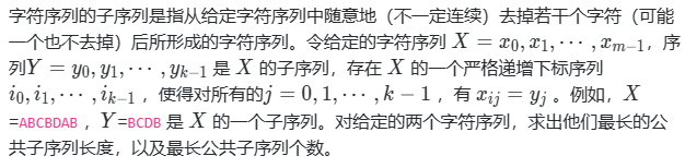 一个给定序列的子序列,是在该序列中(不一定连续)删去若干元素后得到的序列。例如:X = {A,B,C,B, D,A, B},它的子序列有{A, B,C,B,A}、{A,B,D}、{B, C,D,B}等。给定两个序列X和Y,当另一序列Z既是X的子序列又是Y的子序列时,称Z是序列X和Y的公共子序列,最长公共子序列是长度最长的子序列。求两个最长公共子序列的长度和所有可能出现的最长公共子序列个数。