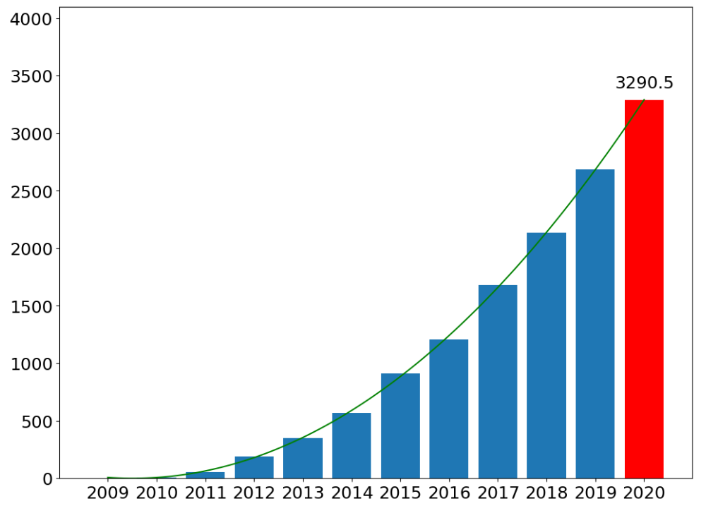 天猫双十一销量与年份的关系是多项式关系!假定,销量和年份之间关系是三次幂关系: