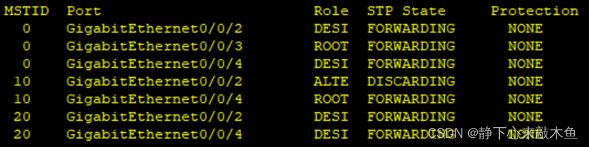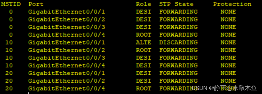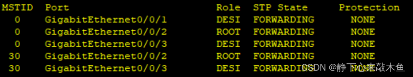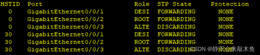实例0在MST1的阻塞端口为LSW6的G0/0/3口(同实例30)