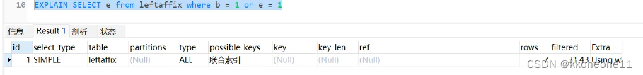 - 在 WHERE 子句中,如果在 or 前的条件列是索引列,而在 or 后的条件列不是索引列,那么索引会失效 举个例子,比如下面的查询语句,b 是主键,e 是普通列,从执行计划的结果看,是走了全表扫描。