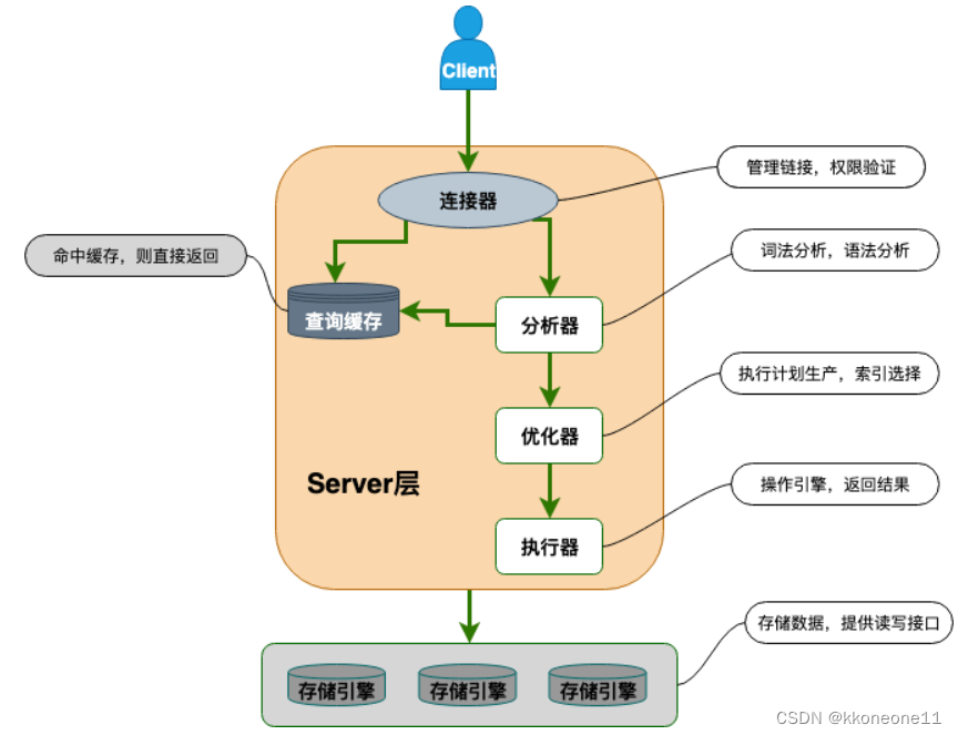 - 客户端发送一条查询语句到服务器,然后将SQL发送到SQL接口;