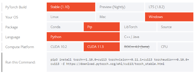 打开PyTorch 官网, 根据官网的安装提示选择符合自己情况的选项, 生成安装语句, 拷贝安装语句进行安装.