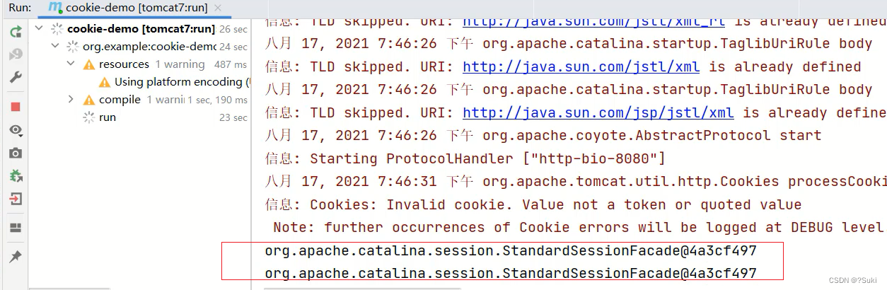 那么它们是一个对象么?要验证这个结论也很简单,只需要在上面案例中的两个Servlet中分别打印下Session对象