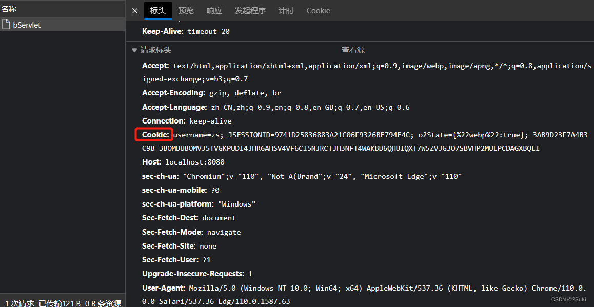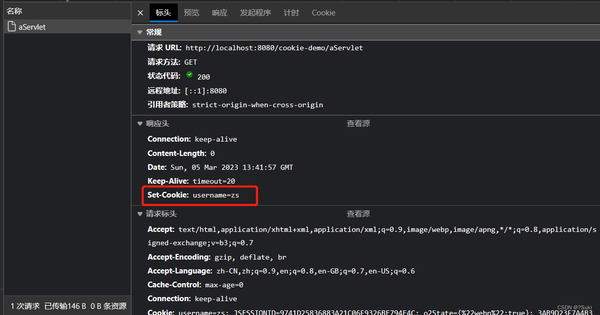 Set-Cookie:username=zs==Set-Cookie对应值username=zs,并将数据存储在浏览器的内存中Cookie: username=zs==发送给服务端BServlet接下来,使用刚才的案例,把上述结论验证下: