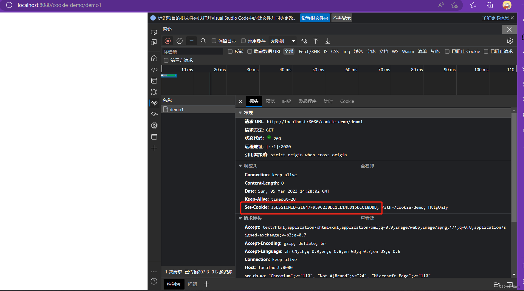 (1)使用chrome浏览器访问http://localhost:8080/cookie-demo/demo1,打开开发者模式(F12或Ctrl+Shift+I),查看==响应头(Response Headers)==数据: