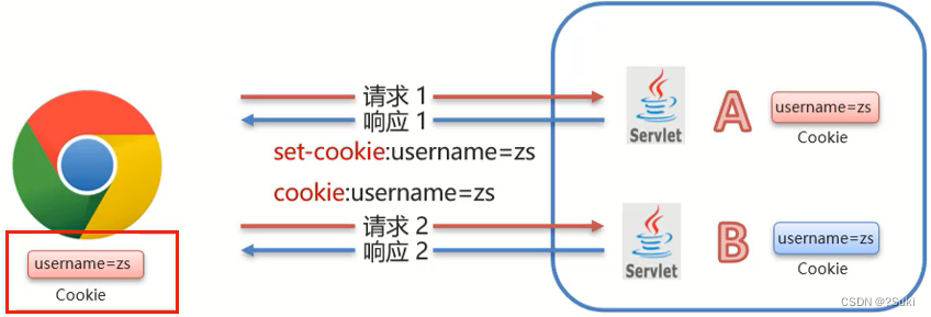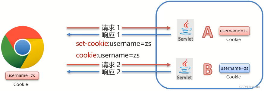 (1)浏览器发送请求给AServlet,AServlet会响应一个存有usernanme=zs的Cookie对象给浏览器