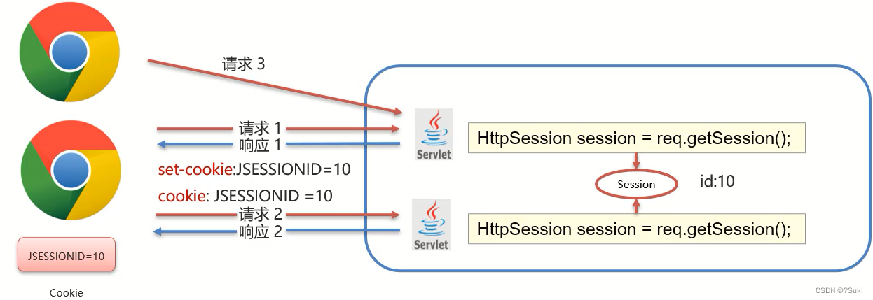 (6)demo2获取到请求后,从请求头中就读取cookie中的JSESSIONID值为10,然后就会到服务器内存中寻找id:10的session对象,如果找到了,就直接返回该对象,如果没有则新创建一个session对象