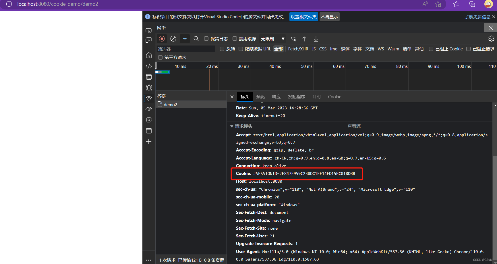 (5)浏览器在同一会话中访问demo2的时候,会把cookie中的数据按照cookie: JESSIONID=10的格式添加到请求头中并发送给服务器Tomcat