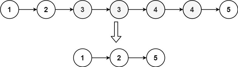 输入:head = [1,2,3,3,4,4,5] 输出:[1,2,5]