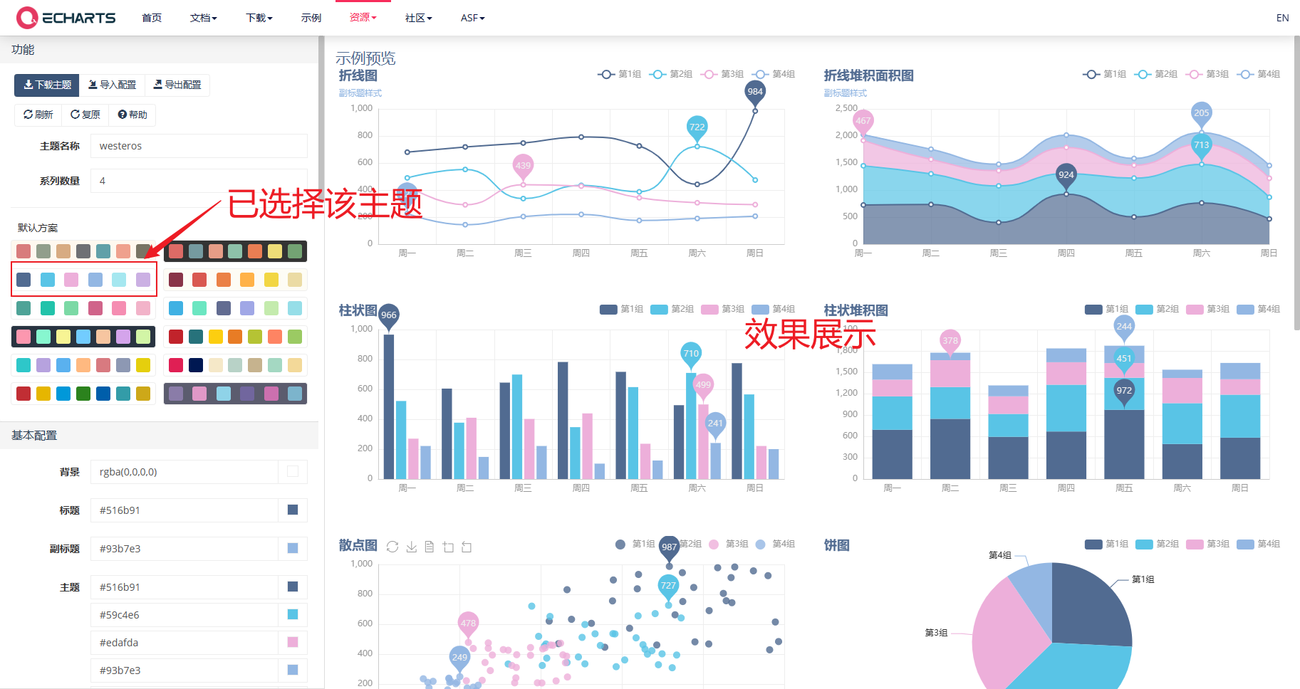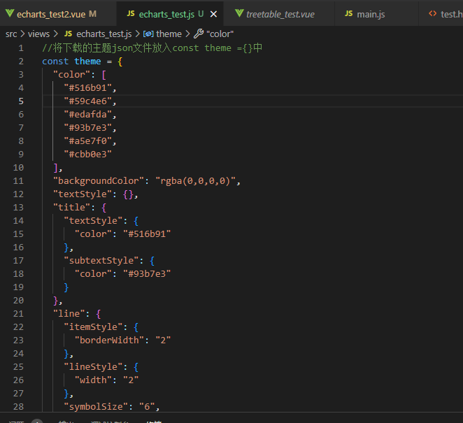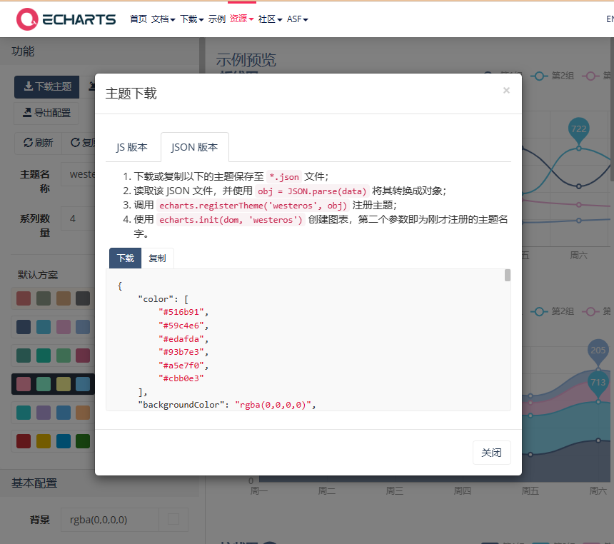 自定义好主题之后可以导出主题代码保存为一个js文件,引入目标页面在代码中使用该主题