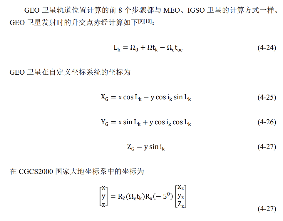 BDS的卫星位置解算与GPS卫星有很大相似之处,其中MEO与IGSO卫星位置解算与GPS一致,GEO卫星从计算升交点赤经开始有所变化,在解算位置前,需要根据卫星的PRN号来判断卫星的种类,GEO计算公式如下(公式选自本科时期的论文,如有错误多多包涵):