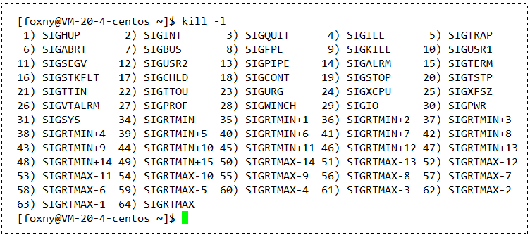 当进程收到信号时,就代表进程异常了。进程程出,如果是异常退出,是因为该进程收到了特定的信号。其实除了 9 号信号还有很多信号,输入 kill -l 就可以查看这些: