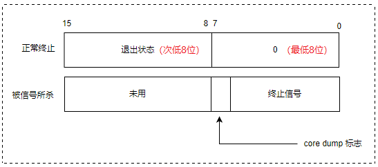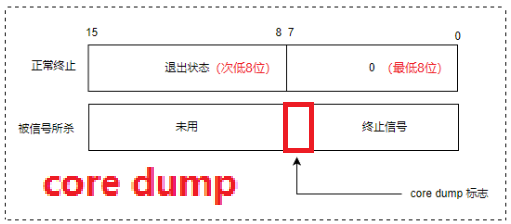 我们的 status 的低八位用于表示处理异常的地方,其中有 1 位是 core dump,我们下面讲。