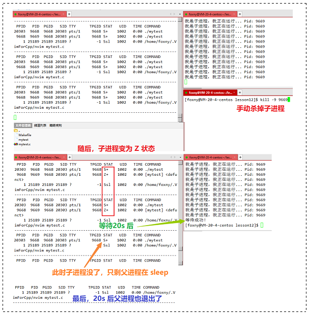 💡 说明:简单来说,就是让父子进程都跑起来,并各自打印消息,子进程一直死循环运行,父进程将自己休眠 20 秒,在这 20 秒之内我们手动把处于死循环的子进程给 kill 掉,此时子进程会处于 Z 状态,此时父进程还在休眠不会立即调用 wait(这么做是为了便于观察)。