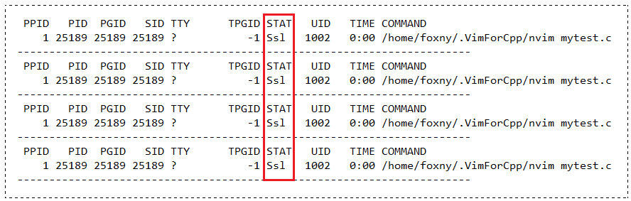 $ while :; do ps ajx | head -1 && ps ajx | grep mytest | grep -v grep; echo "-----------------------------------------------------------------------"; sleep 1; done
