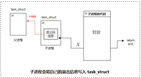 所以,我们的父进程在等待子进程死亡,等子进程一死,就直接把子进程的退出码信息拷贝过去,通过 wait/waitpid 传进来的参数后,父进程就拿到了子进程的退出结果。即 子进程会将自己的退出信息写入 task_struct  。