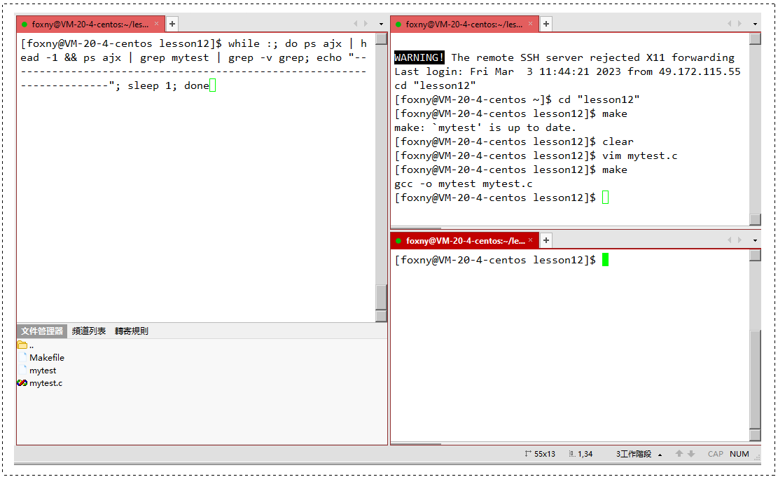 开三个窗口,分别用于运行监控脚本、运行 mytest 和 kill 子进程: