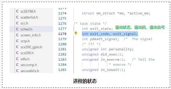 💡 解读:这里我们可以看到 exit_state,这就是退出状态了,下面的 exit_code 和 exit_signal 分别是退出码和退出信号,当一个进程异常退出时该进程会收到信号,所以收到的信号编号也记录在了这里。这两个信息会在子进程任何地方退出时填充,被填充后,父进程就可以读取 task_struct 中的这两个数据,来得到子进程的退出结果。